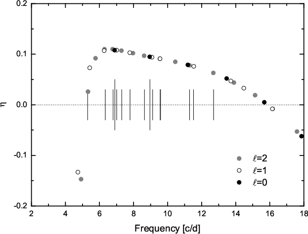 modes. The theoretical frequencies of the mixed modes at 7.79 cd-1 and 9.58 cd-1 are in better agreement with the observations if efficient element mixing in a small overshoot layer is assumed.