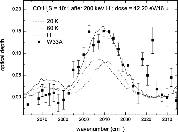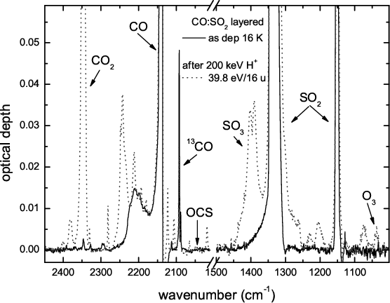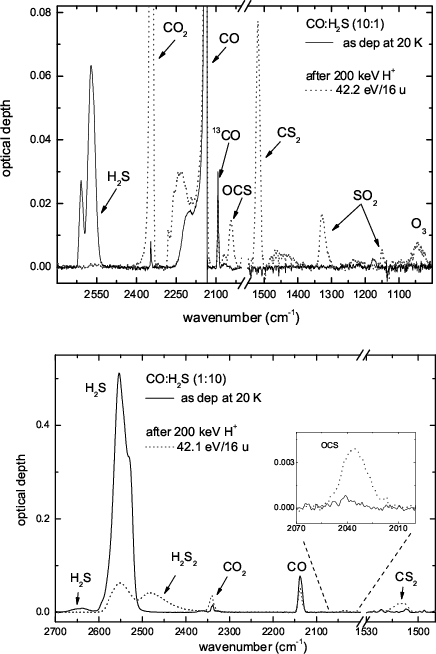 m overlaps with a feature of methanol (CH3OH). The gaseous OCS molecules observed in hot cores are thought to have originated on dust grains (Hatchell et al. 1998). The parent molecules of OCS are not yet known. Ferrante et al. (2008) recently suggested that OCS is a product of ion irradiation of a mixture of CO and H2S ice. For our study, we carried out several irradiation experiments on ices containing SO2 and H2S