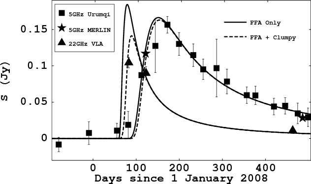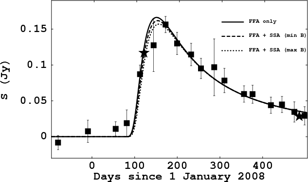 The model given by Eq. (1) predicts the same power-law decay of flux density at all frequencies in the optically-thin regime. If we compare the flux densities at 22 GHz reported in Brunthaler et al. (2009b) with the predictions of our model at 22 GHz, we see that the two latest data points fit the model remarkably well. Indeed, according to our model, the first flux density measurement was made very close to the emission peak at 22 GHz, so strong absorption effects may be affecting the flux density of the supernova at that epoch. Indeed, this situation could explain why Brunthaler et al. (2009b) were unable to fit their 22 GHz light curve to a time power law. The first flux density would not follow the expected behaviour in the optically-thin regime.