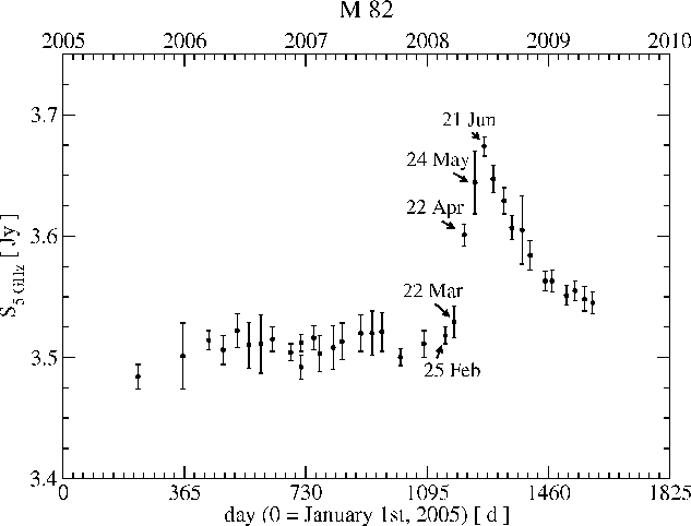 Figure 1: The 5 GHz variability curve of M82, from Urumqi observations performed between August 2005 and May 2009. Up to February-March 2008, the radio emission from the source is nearly constant. The following increase in the measured flux density, culminating around June 2008, is ascribed to the explosion of SN 2008iz. |