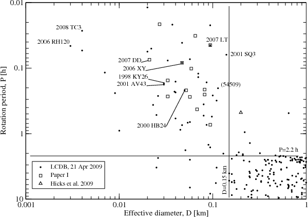 - Recently Masiero et al. (2009) reported six Main Belt asteroids which are larger than 150 m and have spins shorter than 2.2 h, but this result, according to the authors, is still uncertain and so these objects are not presented in Fig. 1.
