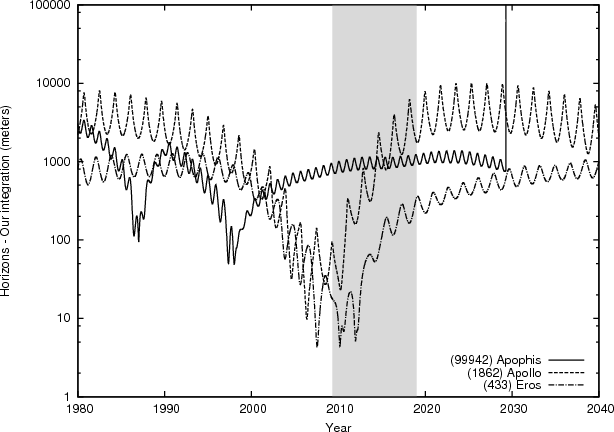 The stability of the integrator was evaluated by performing a backward integration to 1980 followed by a forward integration of 60 years for 3 asteroids: (99942) Apophis, (1862) Apollo, and (433) Eros (Fig. 1). After the forward integration, the positions of the 3 asteroids at the initial epoch were recovered to within 900 m for Apophis, 80 m for Apollo, and 20 m for Eros. The higher values in the case of (99942) Apophis come from multiple, close (within 0.1 AU), planetary encounters with Venus and Earth in the designated time interval (1980.0-2009.19) keeping the integrator from meeting the 10-14 error requirement (Giorgini et al. 2008).