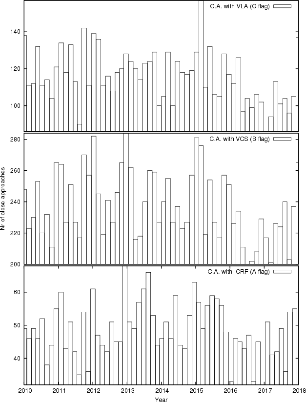 Results. In the designated period (2010-2018), we found a number of 2924, 14 257, and 6972 close approaches (within 10
