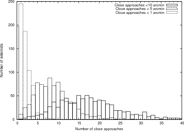 In the time interval 2010-2018, we found a number of 2924, 14 257, and 6972 close approaches (within 10