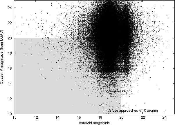 Figure 5: The magnitude distribution of apparent close approaches between the numbered NEAs and all LQAC quasars. The shaded area represents the location of the events available for observations to typical ground-based observatories. |