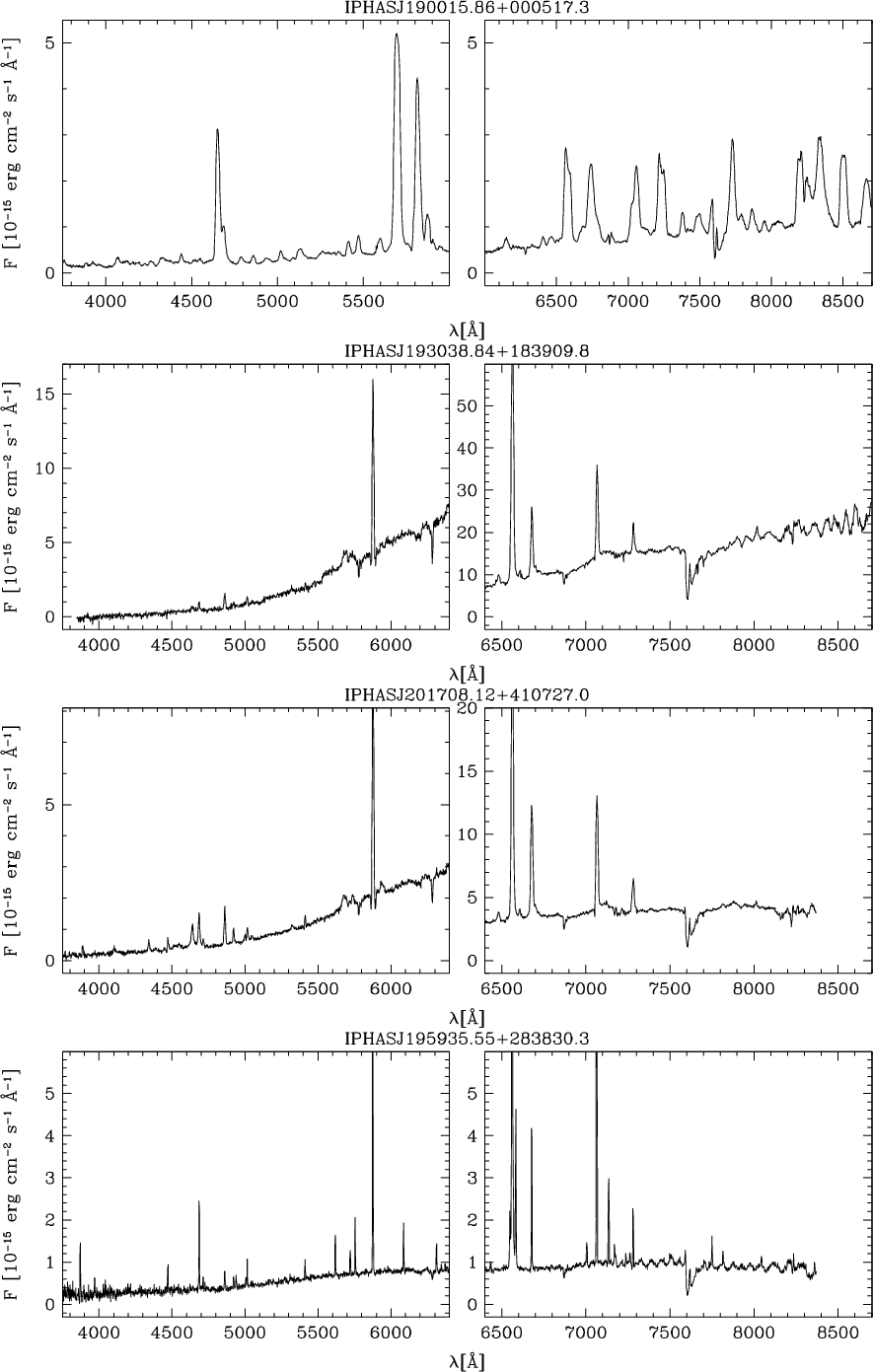Figure 8: Spectra of the Wolf-Rayet stars IPHASJ190015.86+000517.3 ( top), IPHASJ193038.84+183909.8 (second row) and IPHASJ201708.12+410727.0 (third row). The spectrum of the helium-rich source IPHASJ195935.55+283830.3 ( bottom), also possibly related to a WR star, is shown in the bottom panel. |