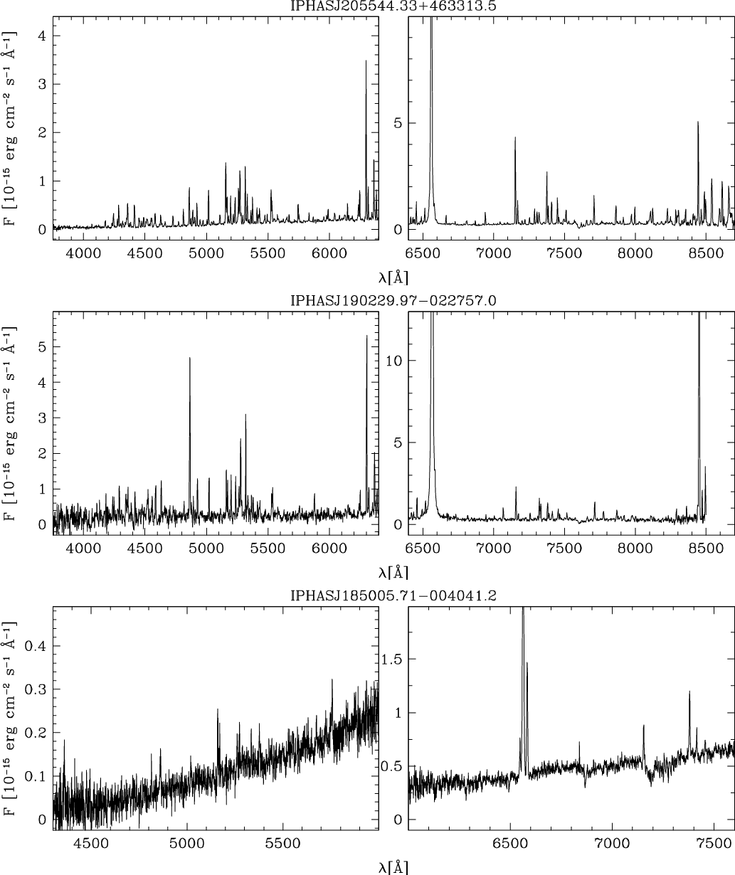 Figure 10: Spectra of the B[e] stars IPHASJ205544.33+463313.5 ( top) and IPHASJ190229.97-022757.0 ( middle), and of the source of uncertain nature but with similar [NiII] fluorescent emission IPHASJ185005.71-004041.2 ( bottom). |