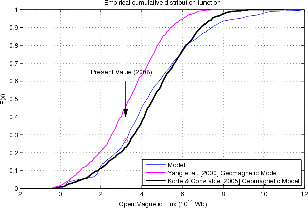 Figure 6: Comparison of the empirical cumulative distribution functions, F(x), of the open flux. The blue line is the distribution of the modeled open flux based group sunspot number (Hoyt & Schatten 1998). Red and black lines are distributions of the open flux based on 14C data (Usoskin et al. 2007) derived from paleo-geomagnetic reconstructions of Yang et al. (2000) and Korte & Constable (2005), respectively. The 2008 annual average is indicated by the red circle. |