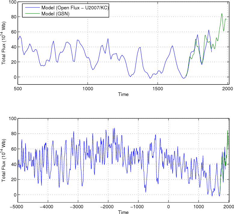 ). We note that the reconstructions obtained based on the two approaches are quite similar, with the reconstruction from Usoskin et al. (2007) having slightly lower values during high activity. Both reconstructions are based on the open flux estimate by Usoskin et al. (2007) using the Korte & Constable (2005)