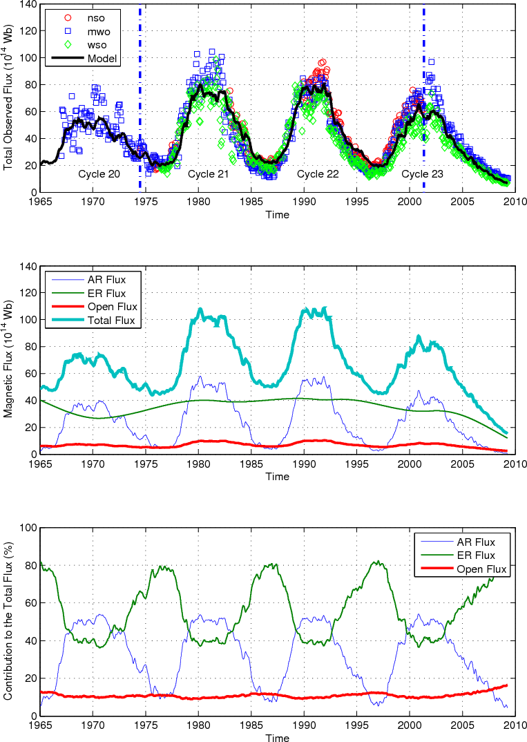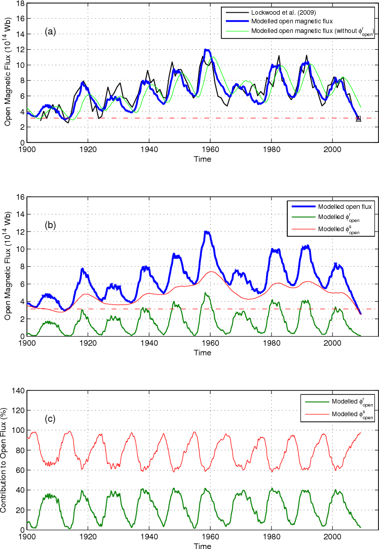 AcknowledgementsWe would like to thanks N. Krivova for the helpful and fruitful discussions. We thank C.N. Arge, J.W. Harvey, H.P. Jones,Y.-M. Wang and N.R. Sheeley Jr. for providing the photospheric magnetic flux data, as well as M. Lockwood for providing the open flux reconstructions based on the aa-index. The PIKAIA optimization subroutine used in this work is available from http://download.hao.ucar.edu/archive/pikaia/. The OMNI data were obtained from the GSFC/SPDF OMNIWeb interface at http://omniweb.gsfc.nasa.gov. The sunspot data were obtained from the National Geophysical Data Center (NGDC, http://www.ngdc.noaa.gov/stp/SOLAR/solar.html). This work has been partially supported by the WCU grant No. R31-0016 funded by the Korean Ministry of Education, Science and Technology.