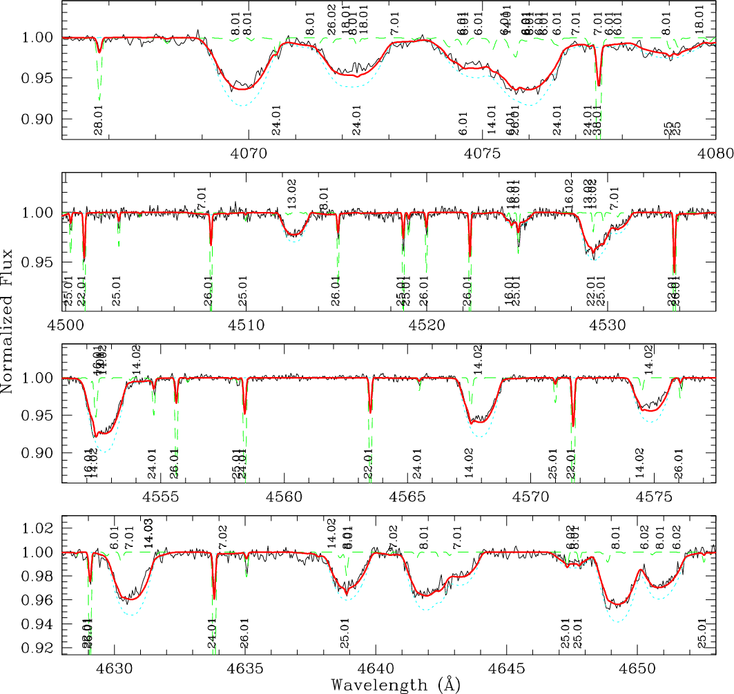 velocities. Atmospheric parameters and abundances are computed by