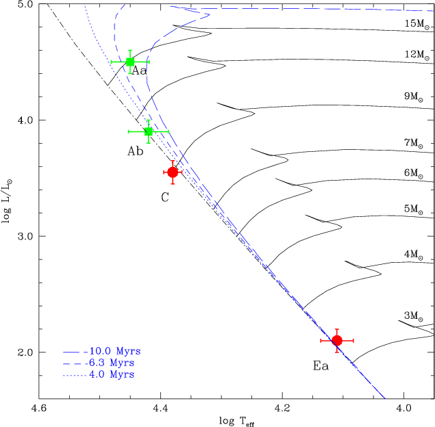 stars are early-B type, near main-sequence objects, which exhibit