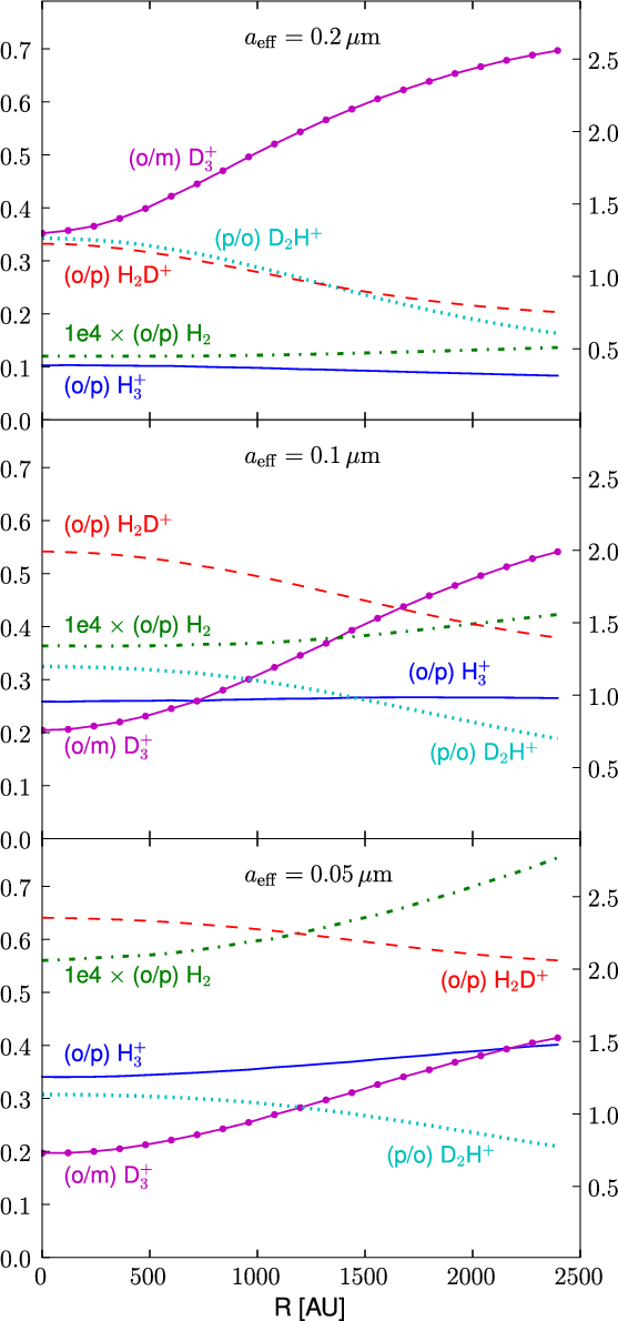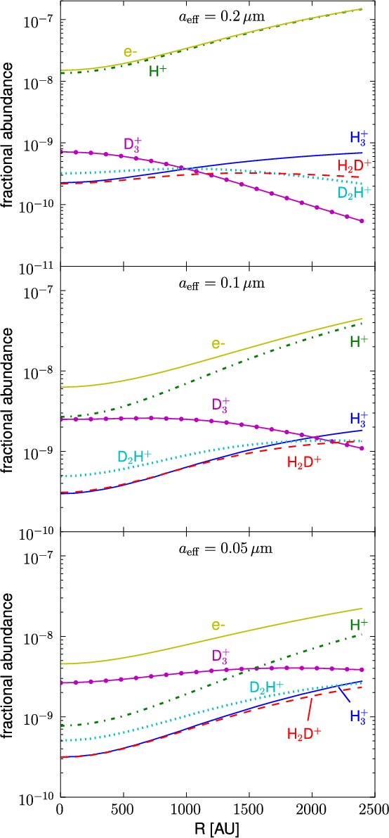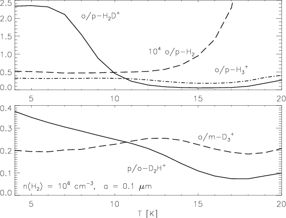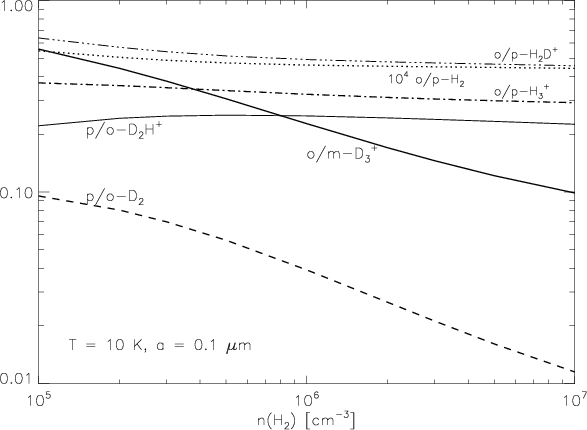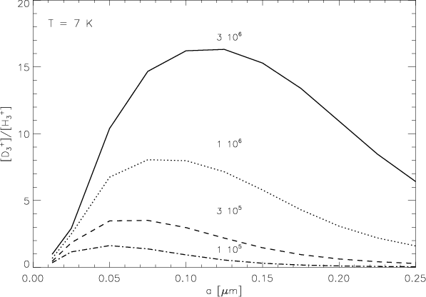Grain processes, in particular the formation of ortho-H2 and the attachment and destruction of positive ions on grain surfaces, are important for the overall degree of deuteration of the cloud (see Sect. 4). The details of these processes (grain surface properties, desorption mechanisms, etc.) were not considered in the present model. It was assumed that chemical reactions on grains (along with the associated adsorption and desorption) take place instantaneously.