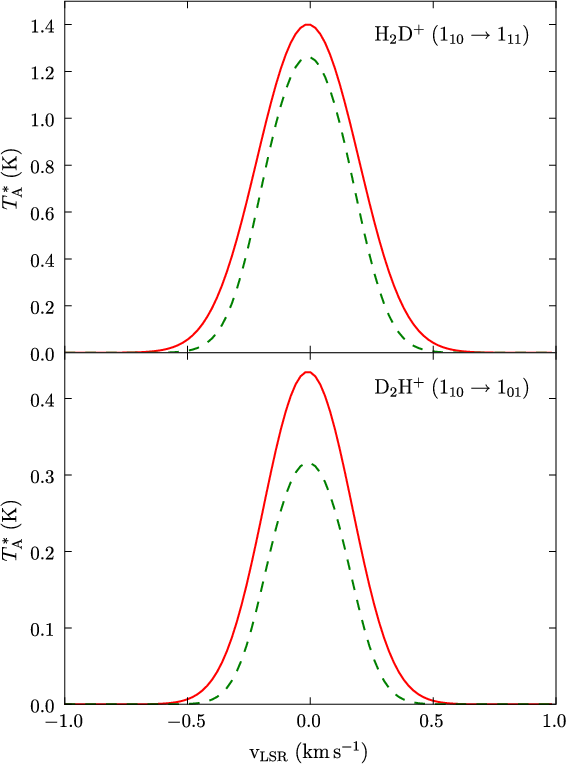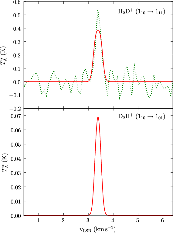 The H2D+ and D2H+ ions are potentially useful probes of pre-protostellar cores (see e.g. Pagani et al. 2009; Caselli et al. 2003; Vastel et al. 2004; van der Tak et al. 2005). Together with the isotopologues H3+ and D3+, they are likely to belong to the most abundant ions in the dense and cold nuclei of prestellar cores, where the usual tracer molecules can have practically disappeared from the gas phase (Walmsley et al. 2004; Roberts et al. 2003) - this state of matters is called ``complete depletion'' in the latter paper. While it has been observed that heavier substances such as CN can exist in the gas phase at densities of the order of 106 cm-3 (Hily-Blant et al. 2008), the assumption of complete depletion remains a valid first approximation at high densities.