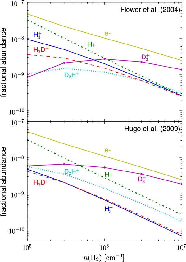 We adopted the complete depletion model discussed in Walmsley et al. (2004) and Flower et al. (2004). The reaction scheme is fairly simple: the gas-phase reactants include only H, H+, H2, H2+, H3+ and their deuterated forms, He, He+, and free electrons. Because of the low temperature associated with the environment, the zero-point energies become relevant and thus the deuterated forms and different nuclear spin modifications have to be considered explicitly. The reaction set also includes cosmic ray ionization, H2 formation on grains, and some other grain processes. We next discuss the gas-phase and grain-surface reactions separately.