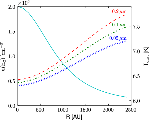 The gas and dust temperatures were assumed to be equal. While this is probably a good approximation in the dense (>