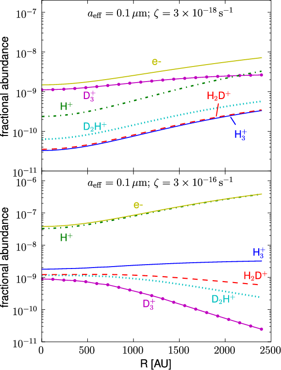 In all our models, we assumed that the core is electrically neutral, i.e. that electron abundance equals the difference between the total abundance of positive ions and the abundance of negatively charged grains.