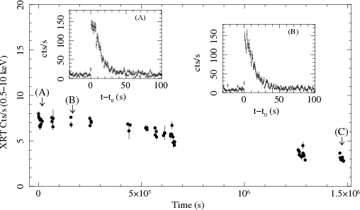 Figure 1: Swift /XRT long-term light curve of the outburst of IGR J17511-3057 (time bin 1000 s, start time 2009 Sept. 13 at 20:00:41 UTC). The arrows in the plot mark the time of the type-I X-ray bursts observed with Swift. The two inserts show a zoom of the first two type-I X-ray bursts (time bin is 1 s). The time on the X-axes of these inserts is measured from the t0 of the bursts. These are 2009 Sept. 14 00:50:27 and 2009 Sept. 15 at 17:17:19 (UTC), respectively. The third type-I X-ray burst (C) is reported in Fig. 2. |