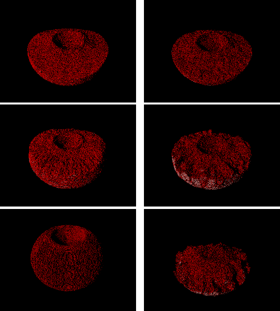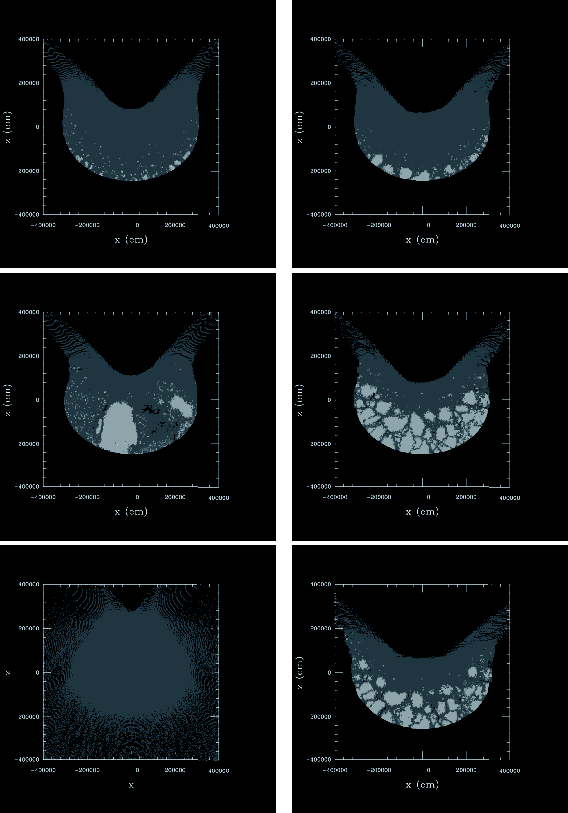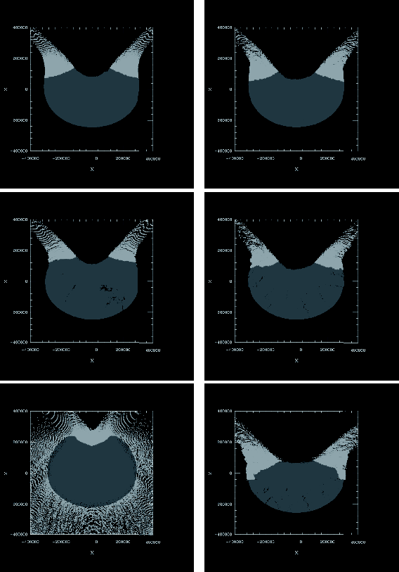 Figure 2: Degree of damage (in gray scale) at 200 s from the time of impact. Dark-gray areas are damaged, while light-gray ones remain undamaged. The internal structure is monolithic ( left) or rubble-pile ( right). Top: microporous (25%), low strength; middle: microporous (25%), high strength; bottom: non-porous, high strength (see Table 2 for definitions of low and high strengths). |
