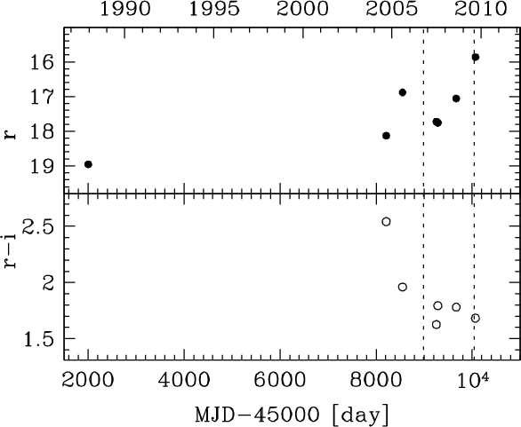 red (F-band) image obtained in 1987 was inspected, and the Sloan r mag of the source was estimated by comparison with nearby stars,