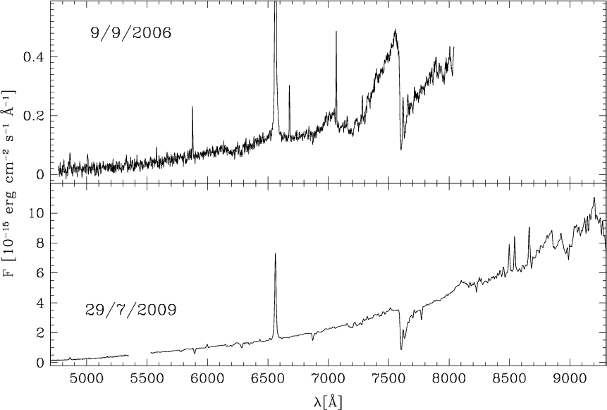 Methods. Photometric data, optical spectra obtained in 2006 and 2009, a higher resolution spectrum resolving the H