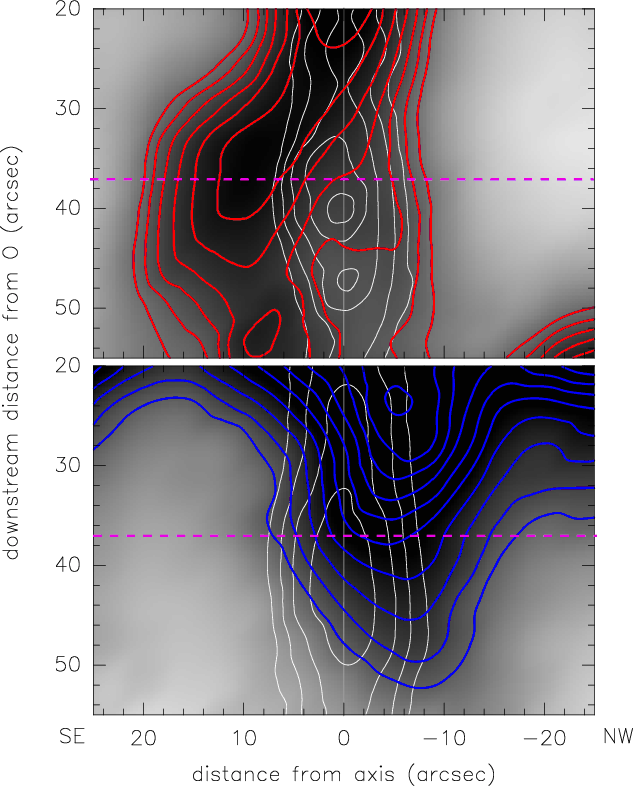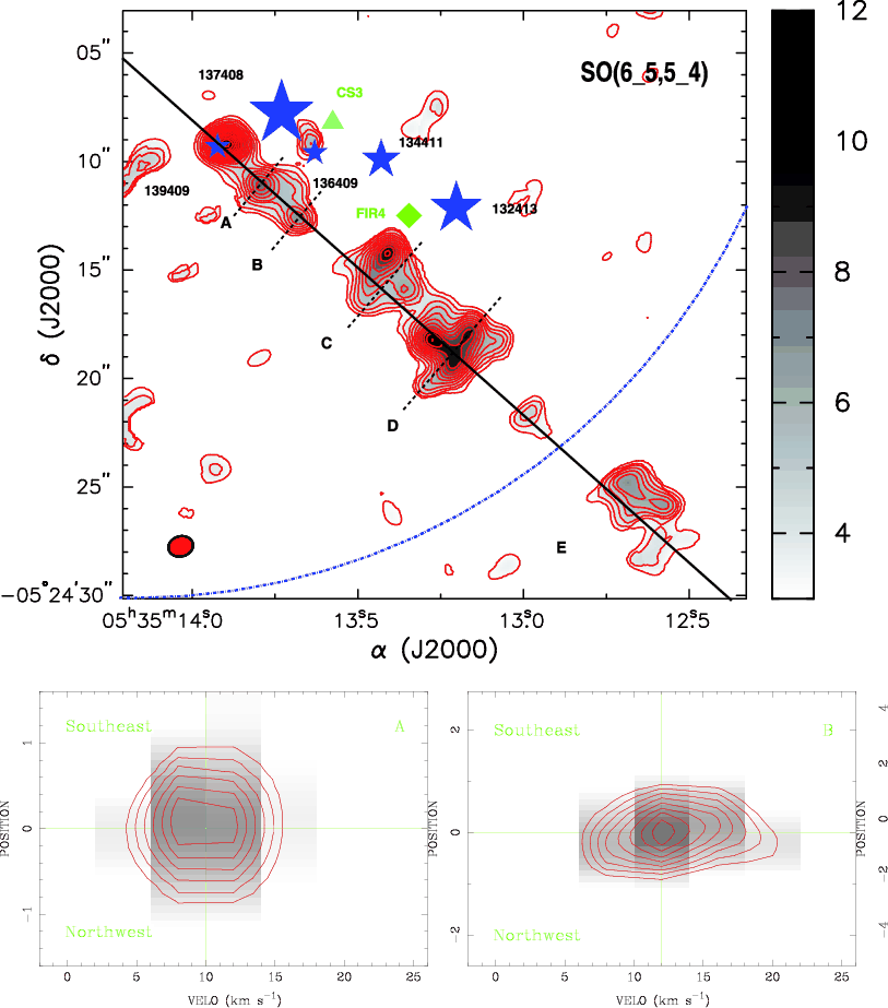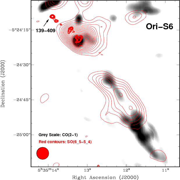 Zapata et al. (2006) suggested that this outflow could be associated with a collimated SiO jet that they had detected in their SMA observations and that is emanating from the CS3/FIR4 region with almost the same orientation. On larger scales and at optical wavelengths, Henney et al. (2007); O'Dell et al. (2008) discussed the possibility that the redshifted lobe of the Ori-S6 outflow is associated with a strong shock (``Southwest Shock''), some 400'' downstream, that is imaged in the Fig. 6 of Henney et al. (2007).