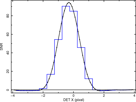 Figure 2: Scan of the Crab PSF (SNR) in a nearly on-axis BAT observation. The stepped line connects points from a skymap generated with a 1/2 pixel grid spacing, while the solid line connects values from a skymap generated with 1/10 pixel grid spacing. |