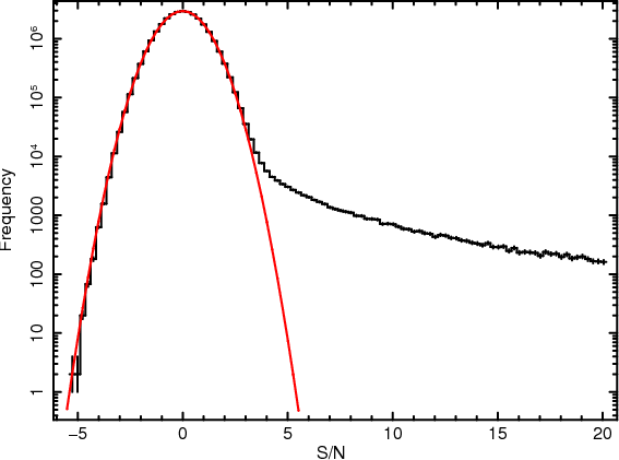 In both analyses, the SNR distribution of the noise in the all-sky map is modeled well by a Gaussian profile with a mean zero and unitary standard deviation. This ensures that the source detection significance can be directly compared.