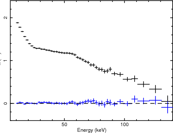 Figure 10: Slope of the dependency of the Crab count rate from the cosine of the off-axis angle as function of energy. The upper data are obtained from count rate without off-axis correction, while the lower data are the values measured after the correction. |