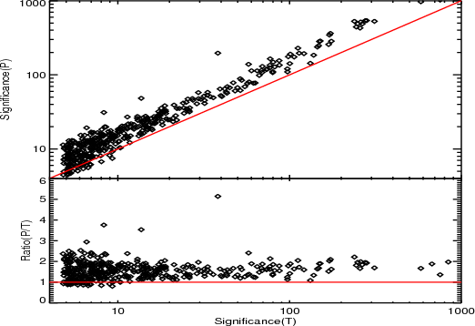 Figure 11: Comparison between the source significance reported in Tueller et al. (2009) (T) and the detection significance obtained with BATIMAGER (P) for the common sources sample ( top panel) and ratio of P to T significances ( bottom panel). |