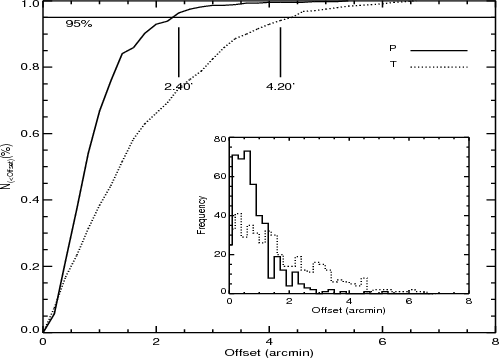 Figure 12: Integrated and differential (inset) distribution of the offset of the BAT sources with respect to their associated counterparts. The solid line represents the results obtained with BATIMAGER (P) while the dotted line refers to the results reported in Tueller et al. (2009) (T). |