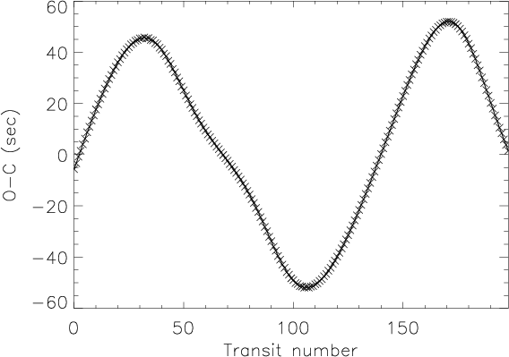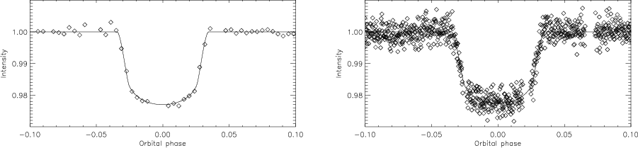 Figure 1: Top: a typical transit observation of CoRoT-1b by CoRoT in the 512 s sampling rate mode. Bottom: a typical transit observation of CoRoT-1b by CoRoT in the 32 s sampling rate mode. Abcissa is phase, ordinate is normalized intensity. The solid lines show the fit. |