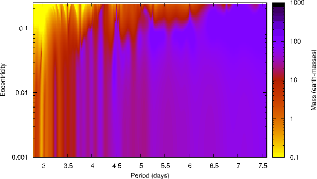 Figure 5: Upper mass limits for a hypothetical second object in the CoRoT-1b system as a function of the perturber's orbital period and eccentricity. |