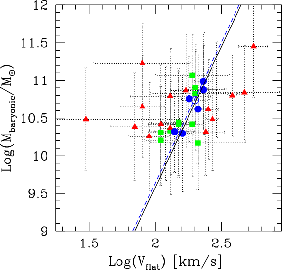 The stellar-mass Tully-Fisher Relation (smTFR) has received increased attention over the past decade, both at low (e.g., Bell & de Jong 2001; Pizagno et al. 2007; Meyer et al. 2008) and high redshift (Atkinson et al. 2007; Flores et al. 2006; Cresci et al. 2009; Kassin et al. 2007; Conselice et al. 2005; Puech et al. 2008). However, the smTFR does not allow us to homogeneously characterize all galaxy morphologies together. McGaugh (2000) showed that dwarf galaxies, which have a larger gas content that more massive galaxies, fall downward the smTFR. Considering the baryonic (i.e., stellar plus gas) content of galaxies, he showed that all galaxies, including dwarves, define a common TFR (see also Begum et al. 2008), which by then was dubbed the baryonic TFR (bTFR). Because the bTFR appears to hold over five decades in mass (McGaugh 2000), it can therefore be considered as being somehow more ``fundamental'' than the smTFR.So far, the bTFR has been studied only in the local Universe (see