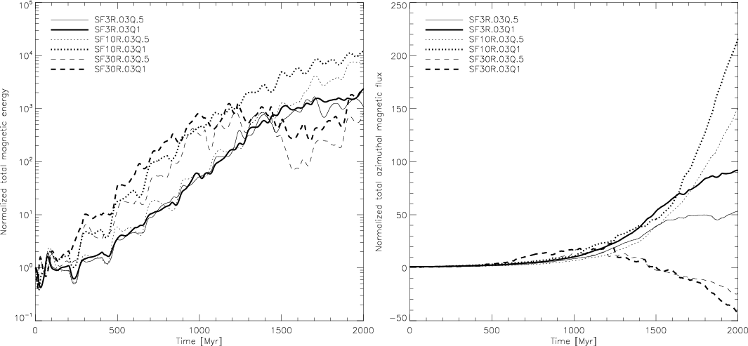 - A shorter period of halted SNe activity leads to faster growth and an earlier saturation time in the evolution of azimuthal magnetic flux.