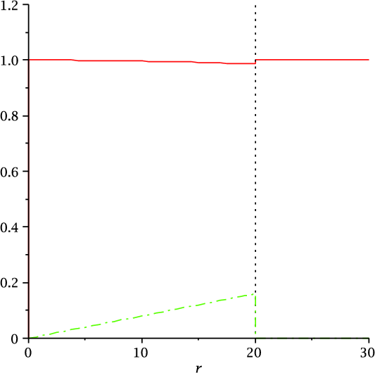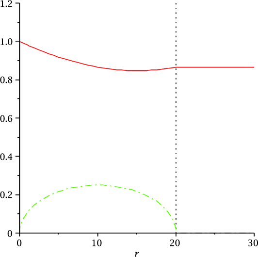 where M is the Whittaker function, K1 the first-order Kummer function, and c2 the constant to be determined from the matching conditions. The solution satisfies the same boundary conditions: it is regular at the origin and zero at infinity. Applying the same matching conditions at r=20 (the solution is continuous, with continuous derivatives), we find the dispersion equation for
