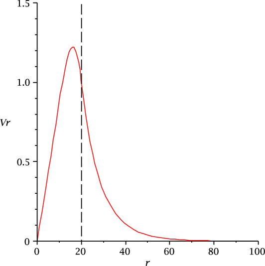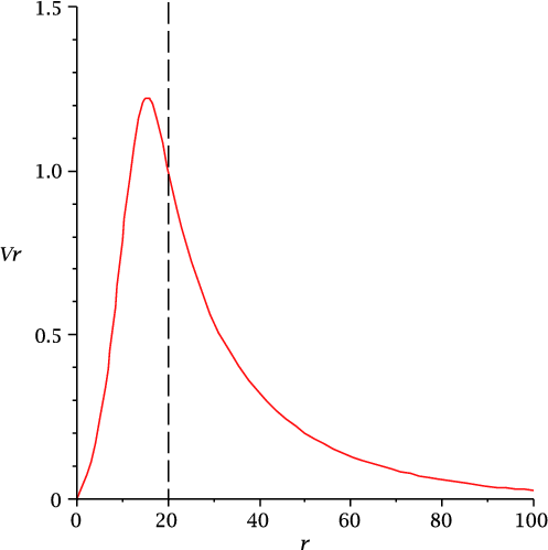 The amplitude of the radial velocity, vr(r) in r, for case B. Here vr(r) is made dimensionless by