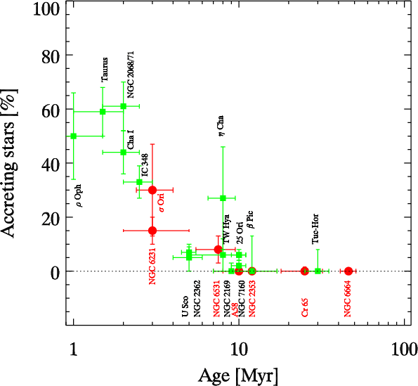 the fraction of stars with ongoing mass accretion decreases fast with time,