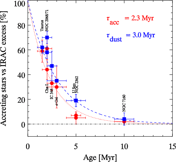the fraction of stars having infrared excess emission (e.g. Hillenbrand 2008; Haisch et al. 2005,2001; Bouwman et al. 2006). This is thought to be caused by