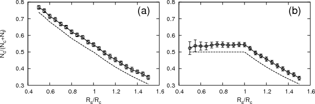 Figure 3: Calculated fraction of cluster stars as a function of the sampling radius for the same simulations as in Fig. 2. The real (simulated) values are shown by dashed lines. |