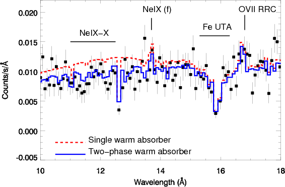 More recent studies have shown that the presence of emission lines in the soft X-ray band brings additional information on the circumnuclear ionised gas. In some Seyfert 1s, emission lines from highly ionised species can originate very close to or within the broad line region of the AGN (Costantini et al. 2007; Longinotti et al. 2008), but only in sources with high signal-to-noise has it been possible to relate the X-ray emitter with the X-ray absorber (NGC 3783, Behar et al. 2003).