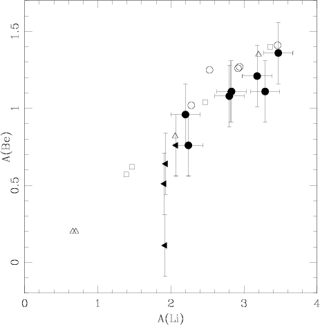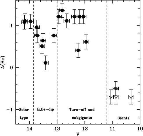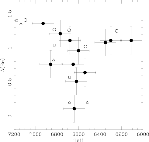 show a Be decline correlated with decreasing temperature. These findings were confirmed by Randich et al. (2007,2002), who