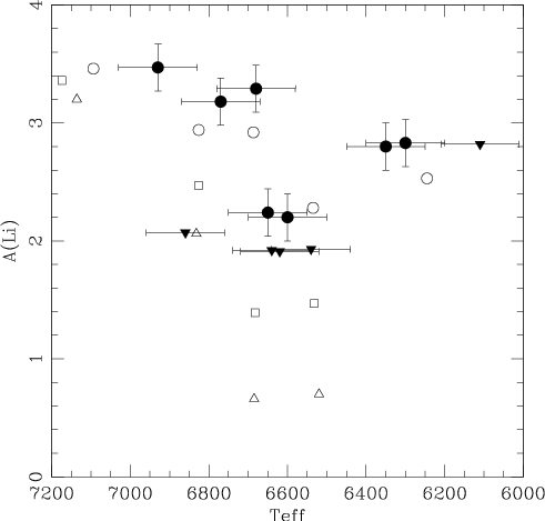 Lithium depletion is seen both in field (e.g., Chen et al. 2001; Lambert & Reddy 2004; Lèbre et al. 1999; Herbig 1965; Duncan 1981; Pasquini et al. 1994, and references therein) and in open cluster stars (e.g. Soderblom et al. 1990; Pasquini et al. 2001; Cayrel et al. 1984; Zappala 1972; Wallerstein et al. 1965; Balachandran 1995; Sestito & Randich 2005; Jones et al. 1997, and references therein). As cluster stars have well-defined masses and, most important, share the same age and initial chemical composition, they are ideal targets for investigating mixing processes as a function of stellar mass and evolutionary status. They have therefore received considerable attention in the literature. Observations of the Li evolution along the color magnitude diagram (CMD) of open clusters have revealed a number of interesting features, such as the Li-dip (Wallerstein et al. 1965; Boesgaard & Tripicco 1986), the lack of abundance trends with age among A-type stars (Burkhart & Coupry 2000,1998), the presence of a spread of Li among solar-type stars in relatively old clusters like M67 (Jones et al. 1999; Pasquini et al. 1997), and the Li variations with mass and evolutionary status as in the case of IC 4651 (Pasquini et al. 2004).