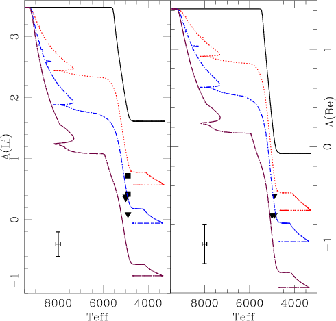 - Randich et al. (2002) compared the Li and Be abundances determined in early G-type stars in old clusters, among which IC 4651 with predictions of models including gravity waves by Montalbán & Schatzman (2000). In these models, rotation-induced processes are ignored, and waves are invoked as the only source of mixing for chemicals in the stellar radiative zone. This is very different from the view proposed by Charbonnel & Talon. In this case indeed gravity waves transport angular momentum, together with meridional circulation and turbulence, but the transport of chemicals is essentially caused by rotation-induced mixing. See the original papers for more detailed information.