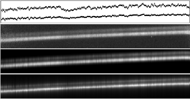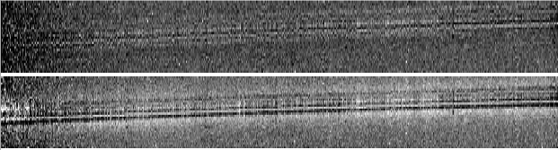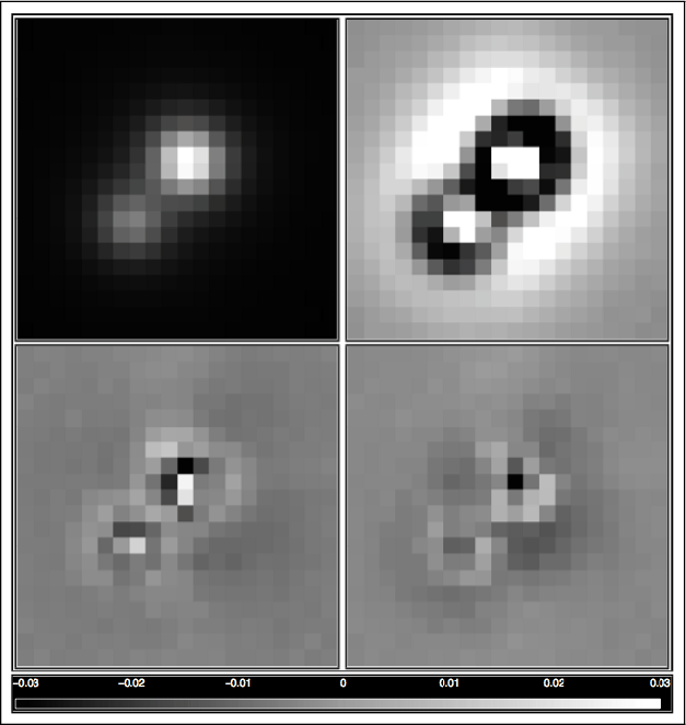 Figure B.2: Residuals of the Gaussian ( top) and Moffat profile fits to the spectral region shown in Fig. B.1. The ill-fitting wings of the Moffat profile suggest that it is not a good approximation for the spatial profile in our spectroscopic images, while the Gaussian profile residuals are almost consistent with the background noise. |