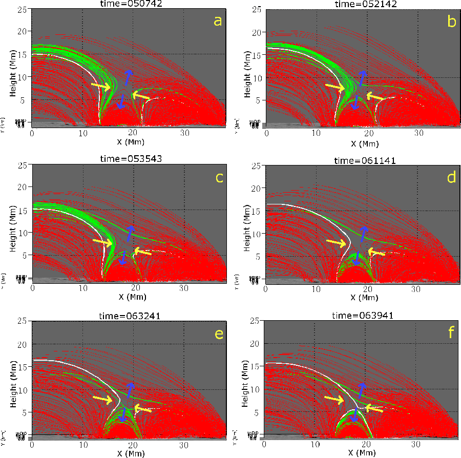 Figure 4: Variations of the extrapolated magnetic field lines in a time period from 05:07:42 to 06:39:41 UT ( a)- f)). These field lines are traced from the footpoint positions, which are shown in Fig. 3a at 05:00:40 UT. A set of green lines and a pair of white lines represent the magnetic field lines as they are reconfigured due to magnetic reconnection. Yellow and blue arrows around the position at [x=18, z=8] Mm represent the plasma inflow and outflow direction just outside the reconnection region. |