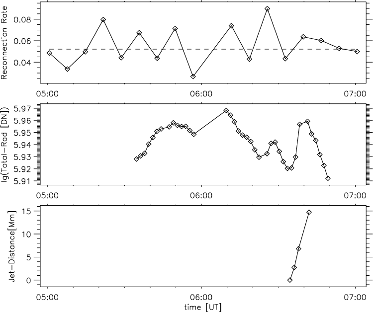 We estimate the non-dimensional reconnection rate at every time step, and plot the profile in Fig. 5a. The non-dimensional reconnection rate is in the range [0.03, 0.09]. Figure 5b shows the time variation of the total X-ray radiation in the area previously shown in Fig. 1. The jet travelling distance is plotted as a function of time in Fig. 5c.