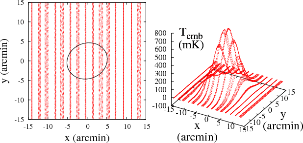 Figure 1: Simulated Jupiter observation with a Planck 100 GHz horn. Each point represent a single sample of the time-ordered data, and the coordinates are in the planet frame, with the x-axis in the cross-scan direction. In the left panel, the telescope pointing at each sample is clearer, and the half-maximum curve is marked. |