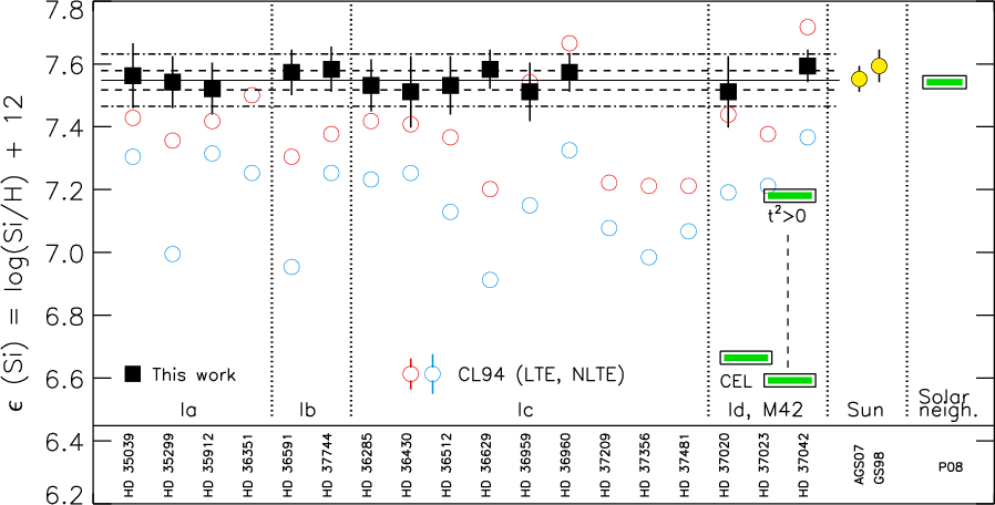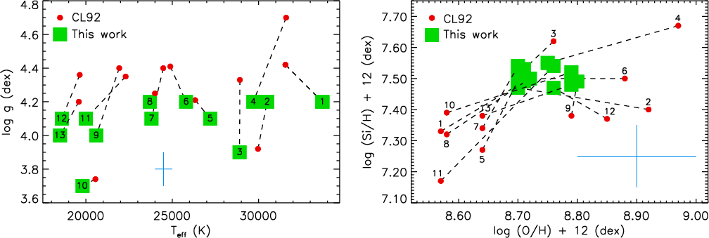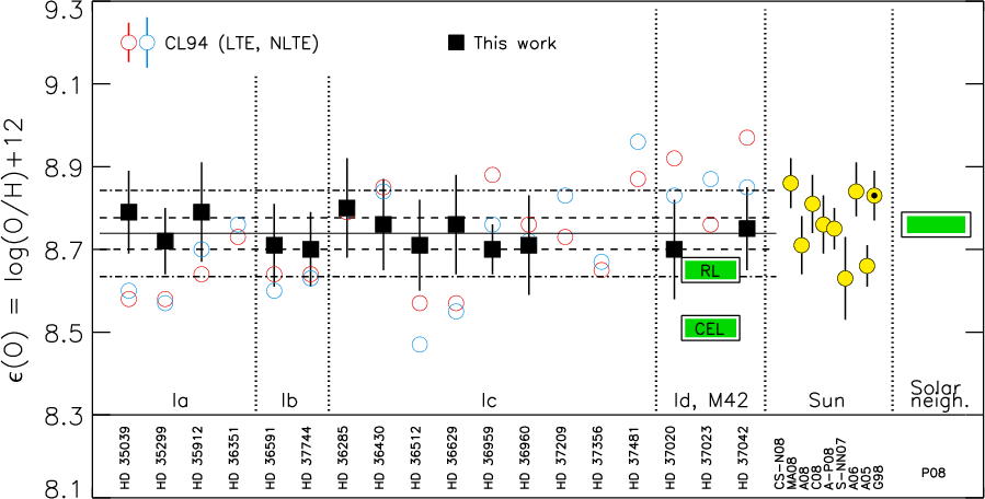 - Other authors (Gies & Lambert 1992; Gummersbach et al. 1998; Kilian 1992) obtained a similar range in oxygen abundances from the analysis of smaller samples of B-type stars in Orion OB1.