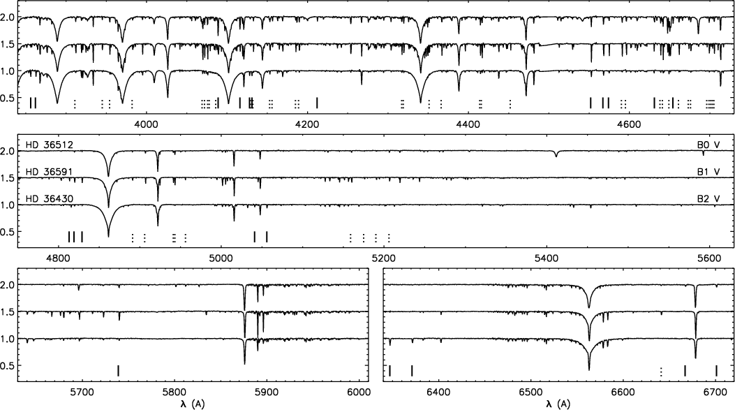 Figure 8: The complete atlas of FIES@ NOT spectra (part 1 of 3). The Si II-IV and O II lines used for the abundance analysis are indicated as solid and dashed vertical lines, respectively. |